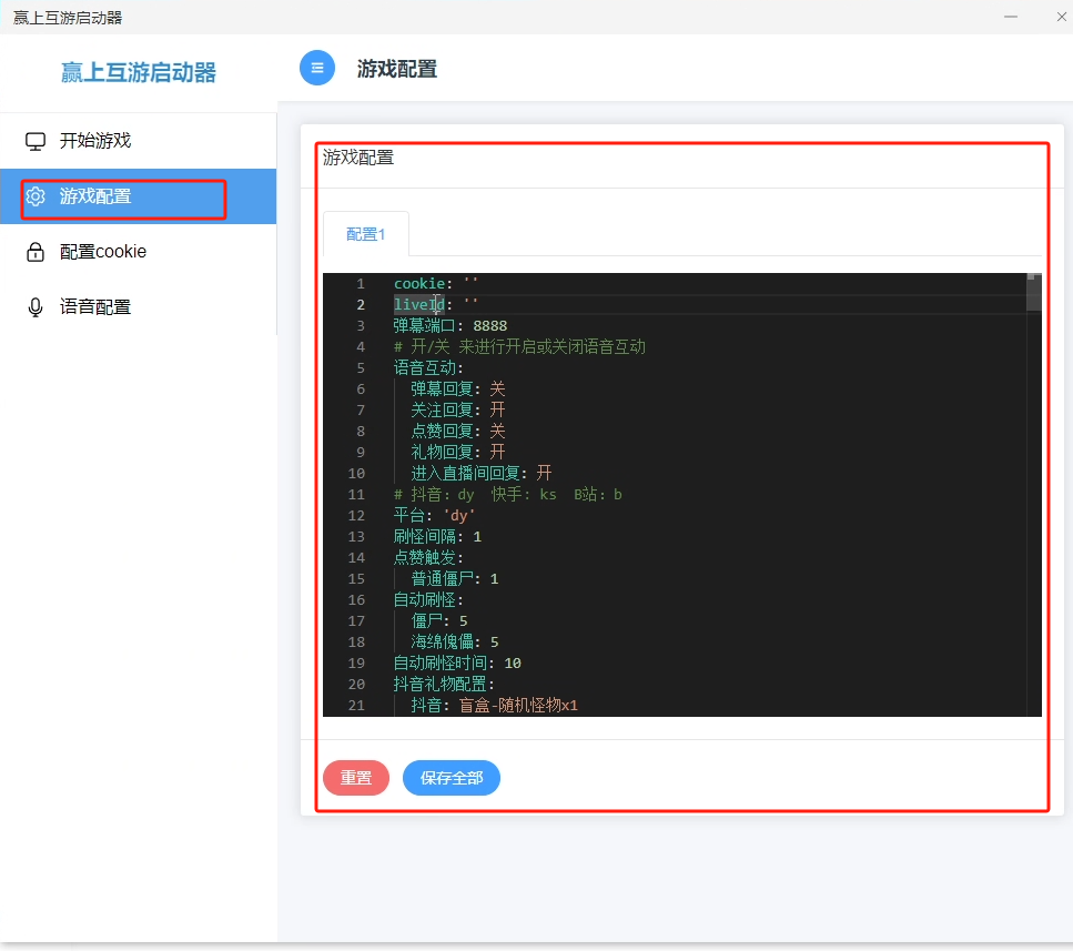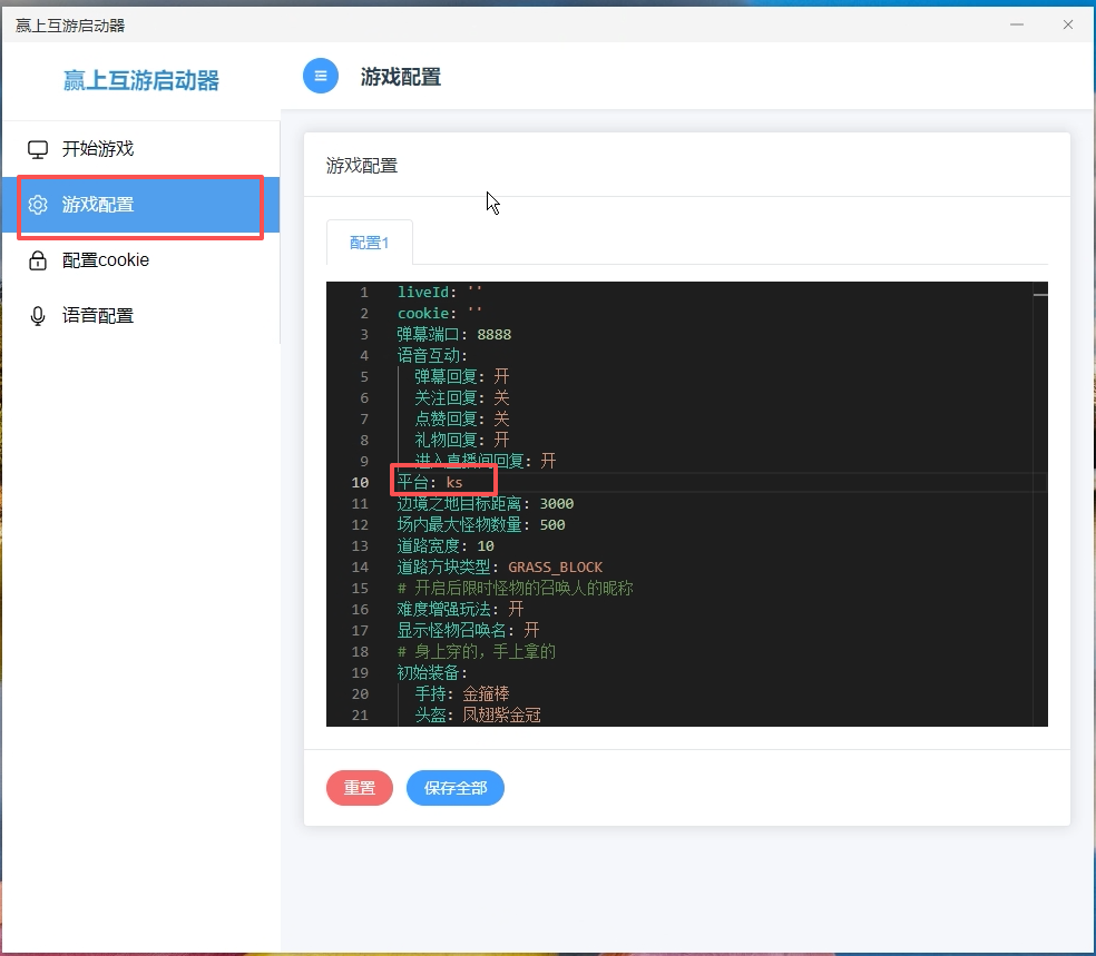 首先打开游戏启动,点击游戏配置,将平台这里改成ks,就是表示快手模式。然后点击下方的蓝色按钮,保存全部