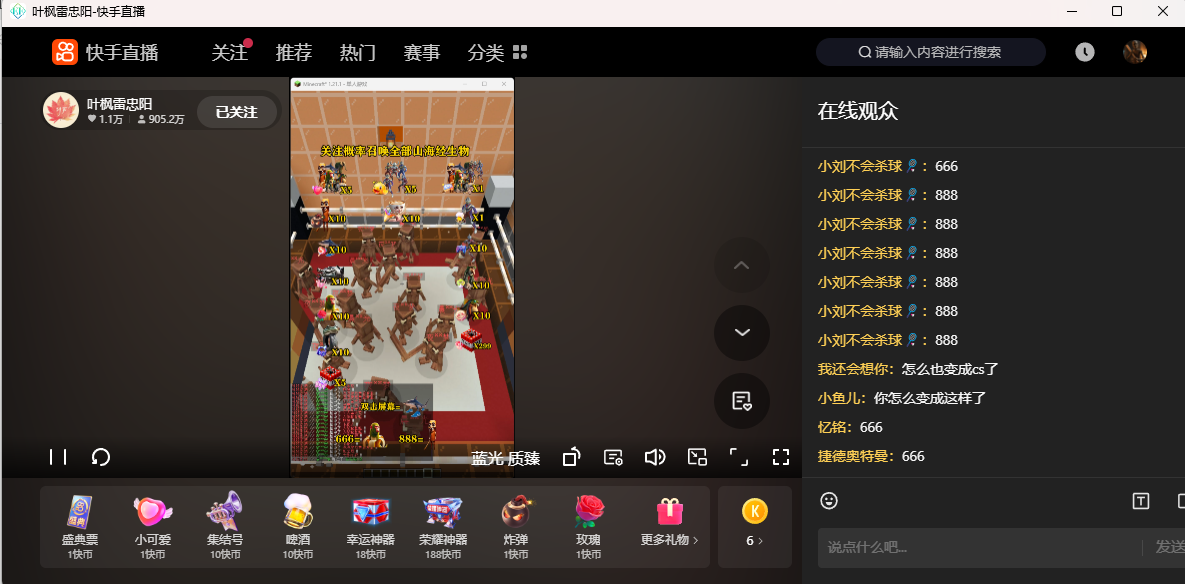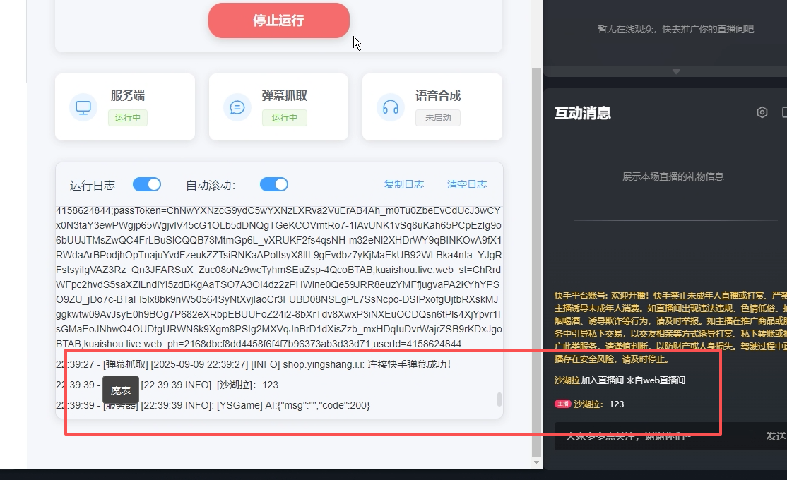 如果提示,快手弹幕连接成功,然后我们发个弹幕,控制台可以看到的话就表示已经连接成功了!接下来就是自动打怪了!