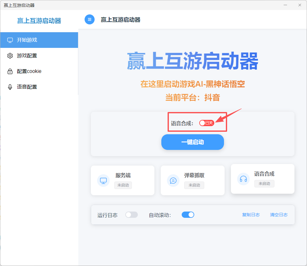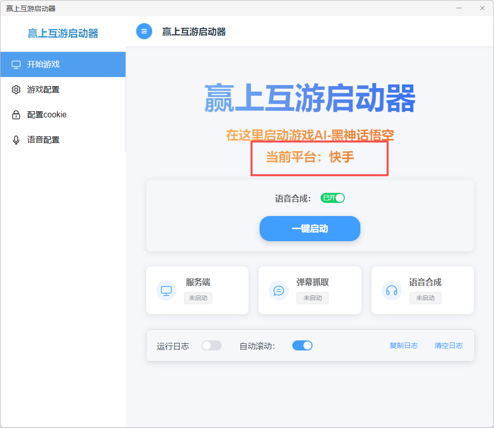 然后点击开始游戏主界面,可以看到现在显示的是快手平台,然后我们打开语音合成,一键启动即可