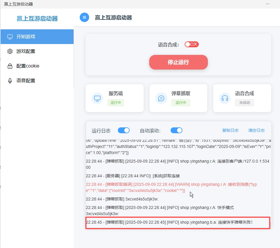 如何提示这个,我们这时候就要看下赢上互游启动器里的日志,看下是否正确连接到了弹幕。